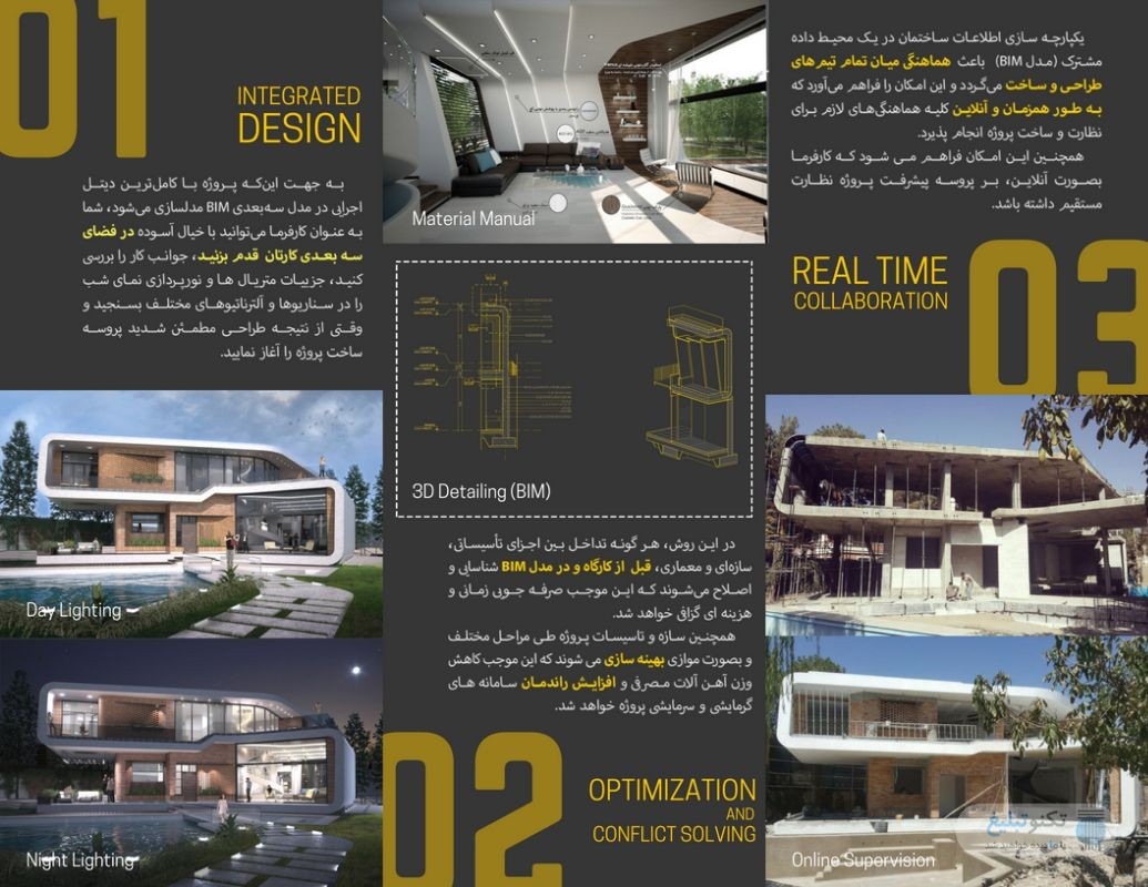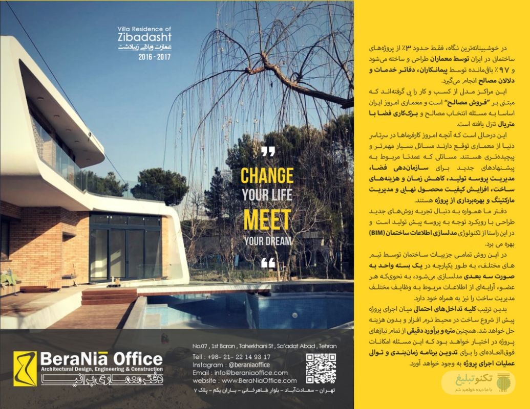 معماری برانیا (BeraNia Office) در تهران طراحی و اجرای صفر تا صد پروژه های خاص با تکنولوژی مدیریت یکپارچه ساخت مدلسازی اطلاعات ساختمان BIM مدلسازی اطلاعات ساختمان چیست همان طور که می دانیم در روش های مرسوم ساخت، نقشه های اجرایی گروه های مختلف طراحی، به صورت جداگانه تهیه می شوند. مهم ترین مشکل این روش عدم هماهنگی ها، اشتباهات و دوباره کاری هایی است که نهایتا علاوه بر بالا بردن هزینه ساخت، منجر به طولانی تر شدن پروسه اجرا و پایین آمدن کیفیت کارتان می گردد. یکی از هیجان انگیزترین پیشرفت های اخیر در زمینه مدیریت ساخت، که امروزه در بسیاری از کشور های پیشرفته مثل آلمان، کانادا، استرالیا، امریکا و .... استفاده می گردد معرفی تکنولوژی مدلسازی اطلاعات ساختمان یا به اختصار BIM می باشد.. در این روش تمامی جزییات ساختمان از سازه ، تاسیسات مکانیکی ، الکتریکی و... تا دیتایل های اجرایی را در کامپیوتر و در یک بسته واحد به صورت سه بعدی مدل می کنیم، به نحوی که هر عضو علاوه بر دارا بودن ماهیت فیزیکی، آرایه ای از اطلاعات مربوط به فعالیت ها و وظایف مختلف مدیریت ساخت (شامل مشخصات مصالح، وزن، رنگ، اندازه، میزان مقاومت در برابر حریق، راهنمای نصب و مونتاژ، الزامات نگهداری و تعمیرات، اطلاعات قیمت اجزاء و...) را به همراه خود دارد.. با این قابلیت، هر گونه تداخل بین اجزای تأسیساتی و سازه ای با یکدیگر یا با بخش معماری، قبل از کارگاه و در مدل BIM شناسایی و اصلاح می شوند که این موجب صرفه جویی زمانی و هزینه ای بسیاری خواهد شد. همچنین ارائه برنامه زمانبندی، تخمین هزینه ساخت و بسیاری از موارد دیگر از جمله ویژگی های این سیستم فوق العاده است که در کاهش هزینه ساخت و زمان اجرا پروژه تان بسیار کارگشا و موثر خواهد بود.