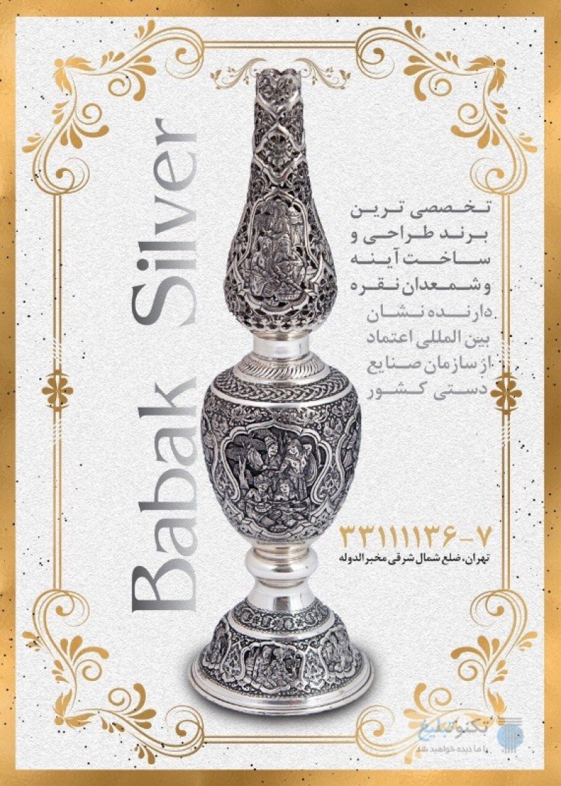 نقره بابک با بهره گیری از بزرگ ترین اساتید ساخت نقره امروز توانسته با کامل ترین مجموعه آینه و شمعدان نقره میزبان سخت پسند ترین عروس و دامادها باشد ، کلیه محصولات نقره_بابک شناسنامه اصالت دارن انتخاب این مجموعه به عنوان برند برتر صنایع دستی نقره در سال های پیاپی گواه بر کیفیت و اصالت دست ساز های نقره بابک می باشد ، ارائه بالاترین کیفیت نقره با مناسب ترین قیمت همواره پشتوانه این موفقیت هاست