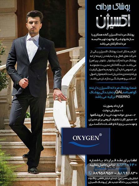 پوشاک مردانه اکسیژن آماده همکاری با سازمانها و شرکتها جهت تهیه البسه مردانه کارکنان می باشد. لازم به ذکر است پوشاک اکسیژن یکی از شرکتهای فعال و با سابقه در زمینه ارائه پوشاک مردانه (کت وشلوار – شلوار – پیراهن ) می باشد. دیدگاه کلان مدیریت مجموعه در خصوص اداره آن ، با توجه به اصول کیفیت و رضایتمندی مشتریان است که بعنوان اصول اساسی و همیشگی سازمان می باشد. ضمنا پوشاک مردانه اکسیژن دارنده گواهینامه QALو نمایندگی پوشاک PISERRO ترکیه می باشد.