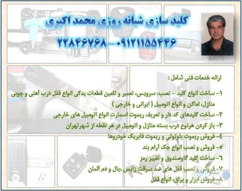 کلید سازی شبانه روزی محمد اکبری ارائه دهنده خدمات فنی شامل : 1- ساخت انواع کلید - نصب، سرویس، تعمیر و تامین قطعات یدکی انواع قفل درب آهنی و چوبی منازل، اماکن و انواع اتومبیل (ایرانی و خارجی) 2- ساخت کلیدهای کد دار و تعریف ریموت اسمارت انواع اتومبیل های خارجی 3- باز کردن هرنوع درب بسته منازل و اتومبیل در هر نقطه از شهرتهران 4- فروش ریموت بلوتوثی و ریموت فابریک خودروها 5- فروش و نصب انواع جک آرام بند 6- ساخت کلید گاوصندوق و تغییر رمز 7- فروش و نصب قفل های ضد سرقت زایس، یال و دم آلمان 8- فروش ابزار و یراق، انواع قفل